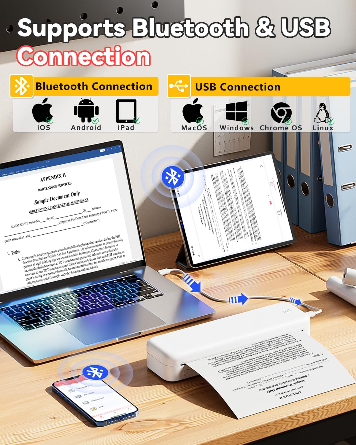 - Imprimante bluetooth portable PhoFuta M834 [Upgrade 4] Compatibilité : Cette imprimante compacte est compatible avec un large éventail d'appareils, y compris les smartphones Android et iOS, les tablettes, les ordinateurs portables Windows 10/11, Linux et macOS. Il suffit de la connecter à votre appareil via Bluetooth (smartphone) ou USB (PC) et d'imprimer. C'est aussi simple et rapide que cela ! (Remarque : les appareils PC ne peuvent être connectés que par USB et nécessitent l'installation d'un pilote).