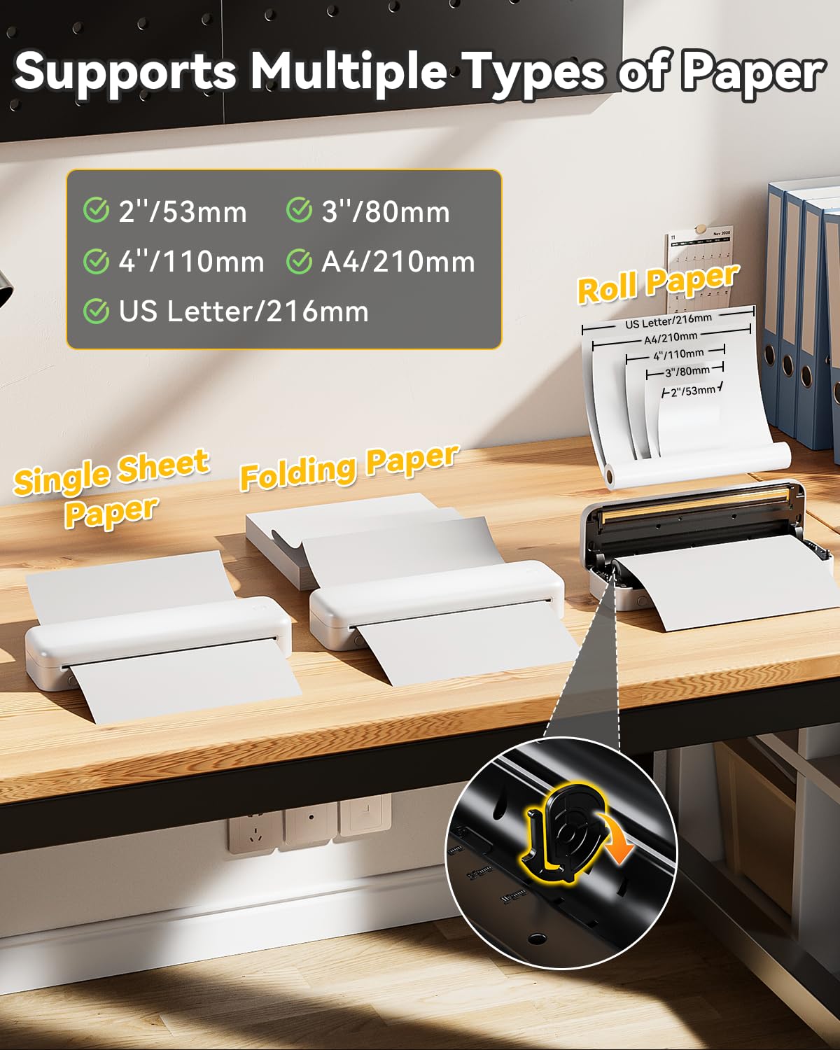 - PhoFuta M834 [Update 2] prend en charge 5 formats et 3 types de papier : L'imprimante portable PhoFuta prend en charge une large gamme de formats de papier, y compris le papier thermique 8.5'' x 11'' US Letter, A4, 4.33'', 3.14'' et 2.08''. Il prend également en charge les types de papier thermique en rouleau, plié et ordinaire pour une variété de scénarios tels que les notes, les examens, les cartes de jeu, les projets de bricolage, les agendas, les reçus, les documents, les contrats et bien plus encore. Que vous soyez un voyageur d'affaires, un enseignant, un chauffeur de camion, un étudiant ou un propriétaire de petite entreprise, cette imprimante est faite pour vous.